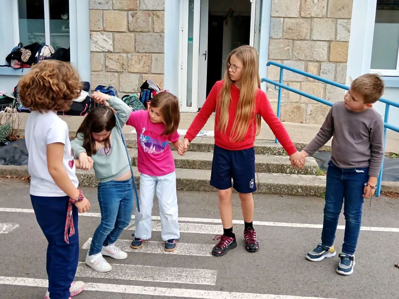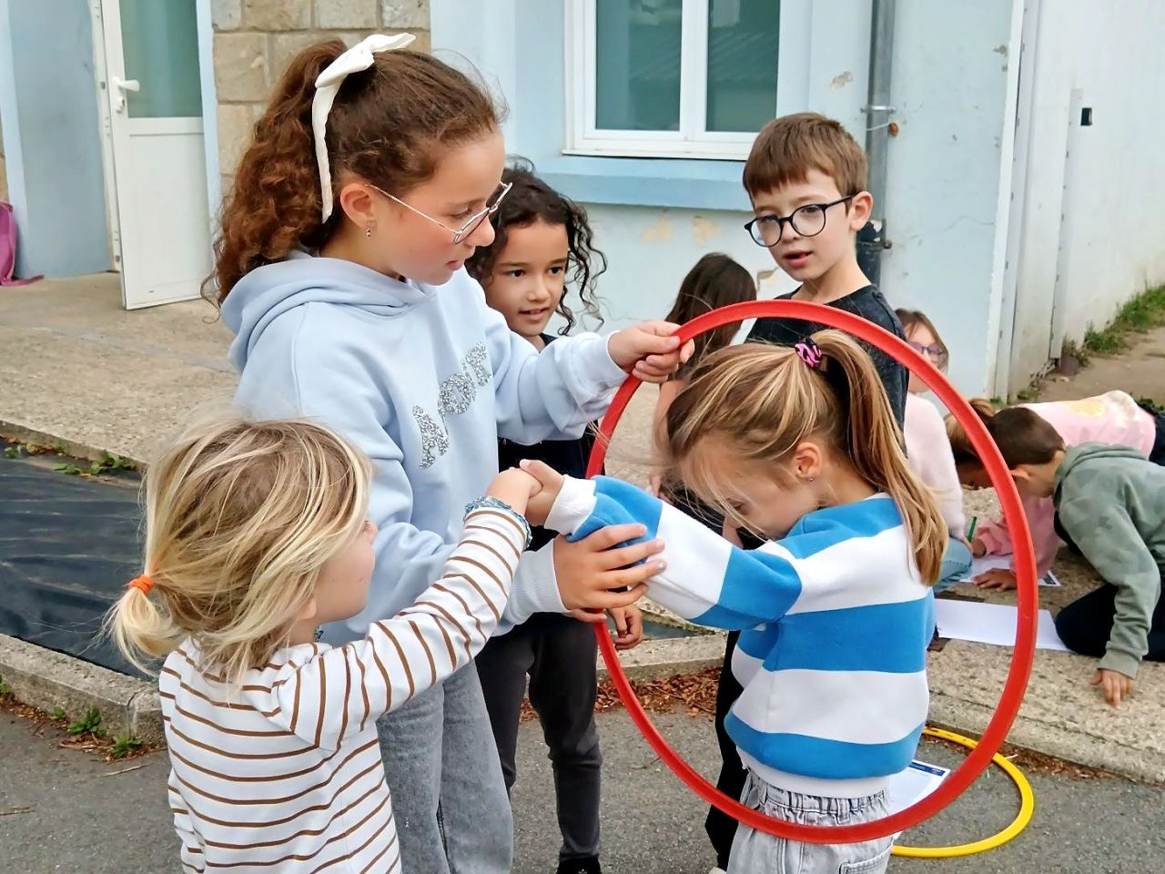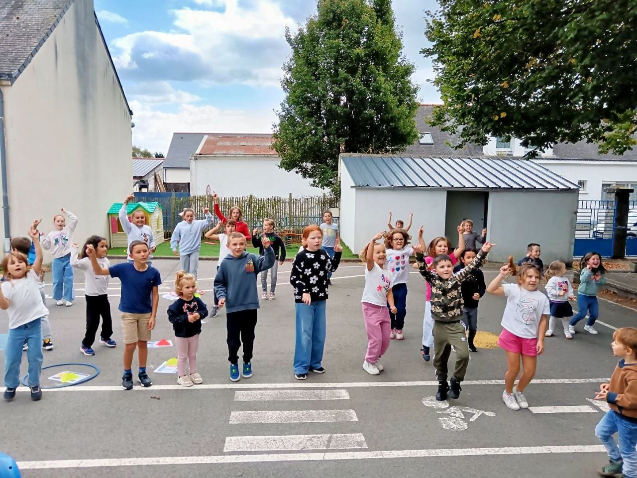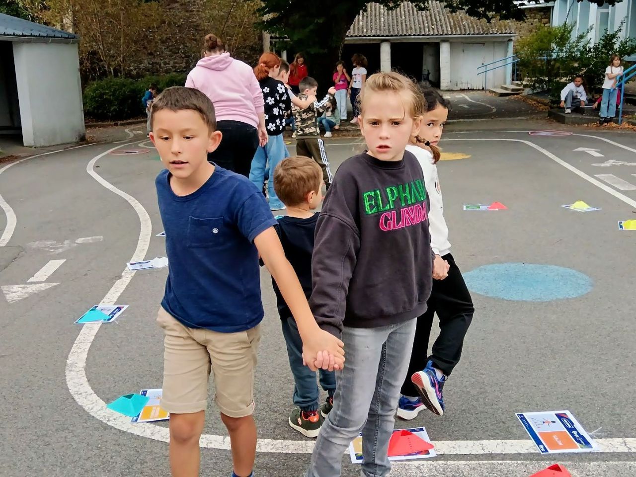 Ce vendredi 26 septembre, tous les enfants de l'école participent sur la cour à un grand jeu de coopération "Ma rentrée avec les régions". Chaque équipe est composée d'enfants de tous âges, de la PS au CM2. Les grands prennent soin des plus jeunes, leur expliquent avec beaucoup de patience ce qu'ils ont à faire.